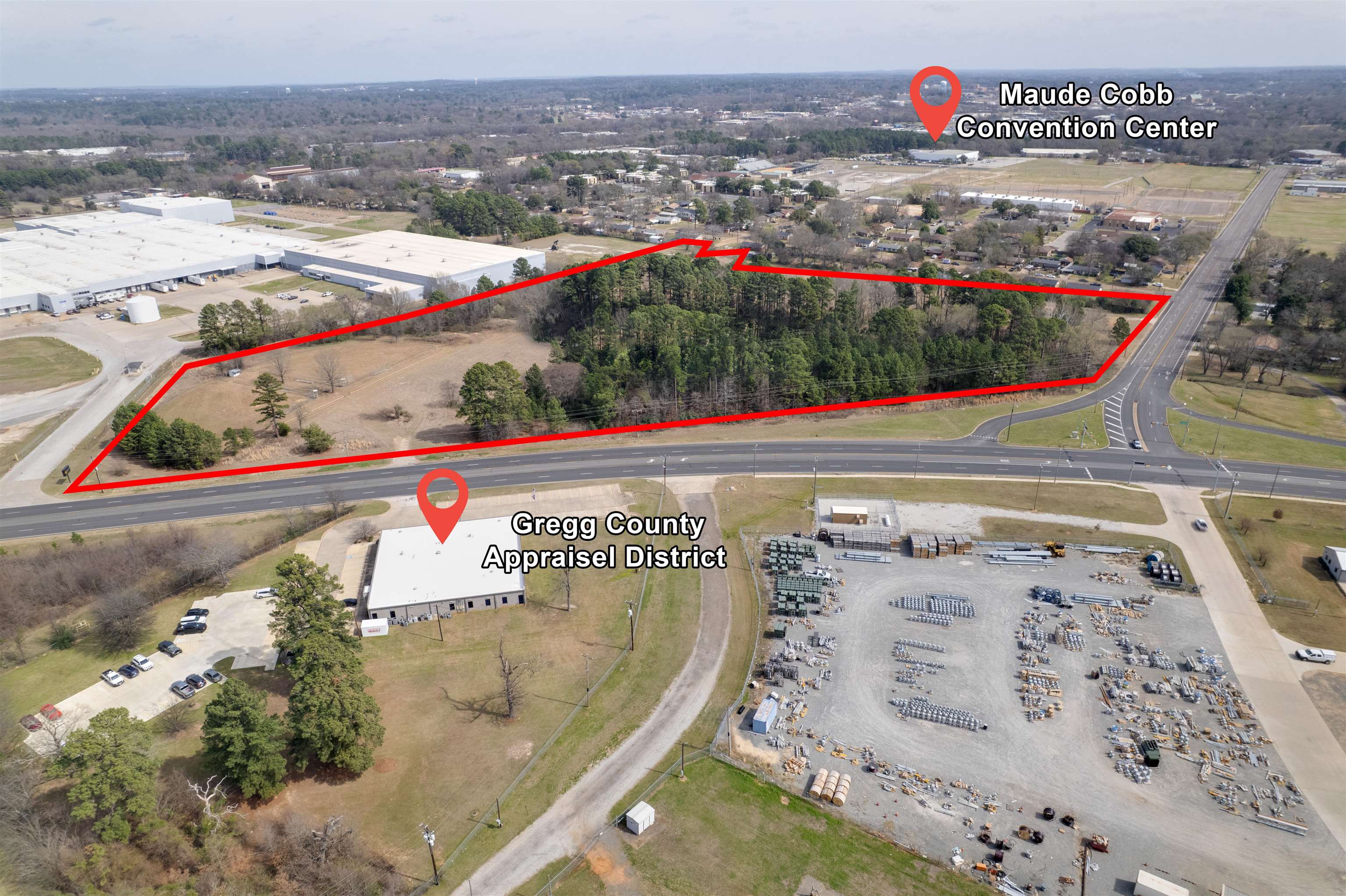 | Excellent development opportunity in a prime Longview location. This 19.91-acre tract sits at the corner of Loop 281 and Jaycee Drive and offers dual road frontage, strong visibility, and convenient access to major citywide corridors. The property is located near the Maude Cobb Convention Center and the Longview Fairgrounds, placing it in a growing area with commercial activity, community events, and ongoing development. With utilities already connected, the tract is well-positioned for a variety of potential uses. The acreage provides flexibility for commercial development, residential projects, or mixed-use opportunities. Its size and corner location offer multiple possibilities for subdivision, phased development, or a large-scale project. Conveniently located approximately 5 miles from Interstate 20 and 1 mile from Highway 31, providing strong regional access for future development. Rare opportunity to secure a large tract in a highly visible and accessible Longview location. Buyer to verify zoning, utilities, and development requirements. | |
